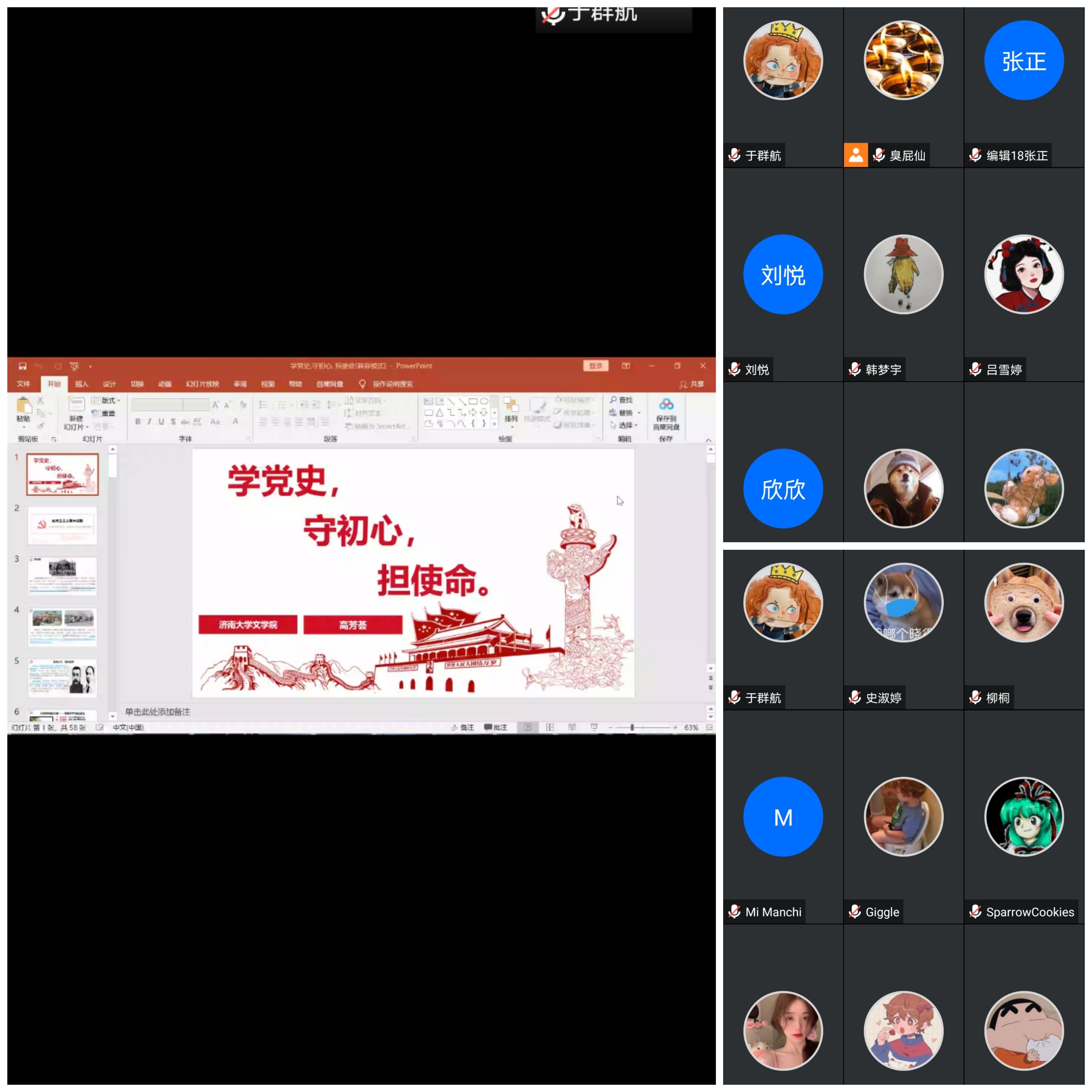 4月17日,英国365集团编辑出版学2018级1班团支部在“新民主主义革命”专题内容材料等充足准备后,在腾讯会议线上召集同学举办了第一次学党史活动。