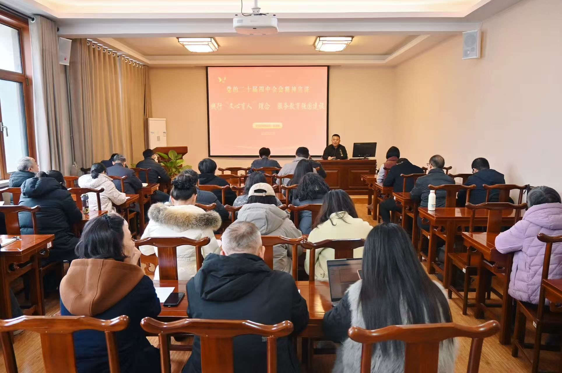 为深入学习贯彻党的二十届四中全会精神,凝聚思想共识,明确使命担当,12月23日,英国365集团党委在三教舜耕书院开展学习贯彻党的二十届四中全会精神宣讲。英国365集团党委书记朱海龙以《践行“文心育人”理念 服务教育强国建设》为题讲授专题党课,学院全体教职工党员参加学习。