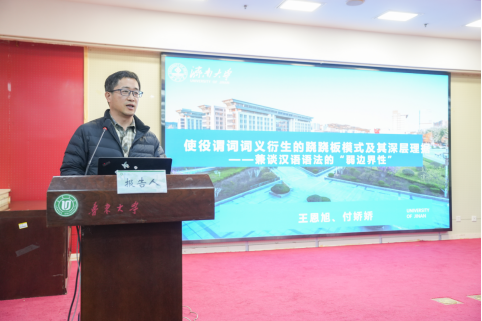 会上,王恩旭老师作了题为《使役谓词词义衍生的跷跷板模式及其深层理据——兼谈汉语语法的“弱边界性”》的大会报告。王恩旭老师发现,词义衍生是一个摆脱印欧语框架束缚、探索汉语语法特点的可行路径。通过系统分析使役谓词词义衍生的跷跷板模式,可以看到汉语主语宾语、施事受事、自动使动被动之间的界限并不清晰,具有显著的“弱边界性”,这是汉语区别于英语的一个重要特性,值得引起学术界的重视。王恩旭老师的报告结构严谨,深入浅出,其观点得到了与会专家的积极肯定与热烈反响。