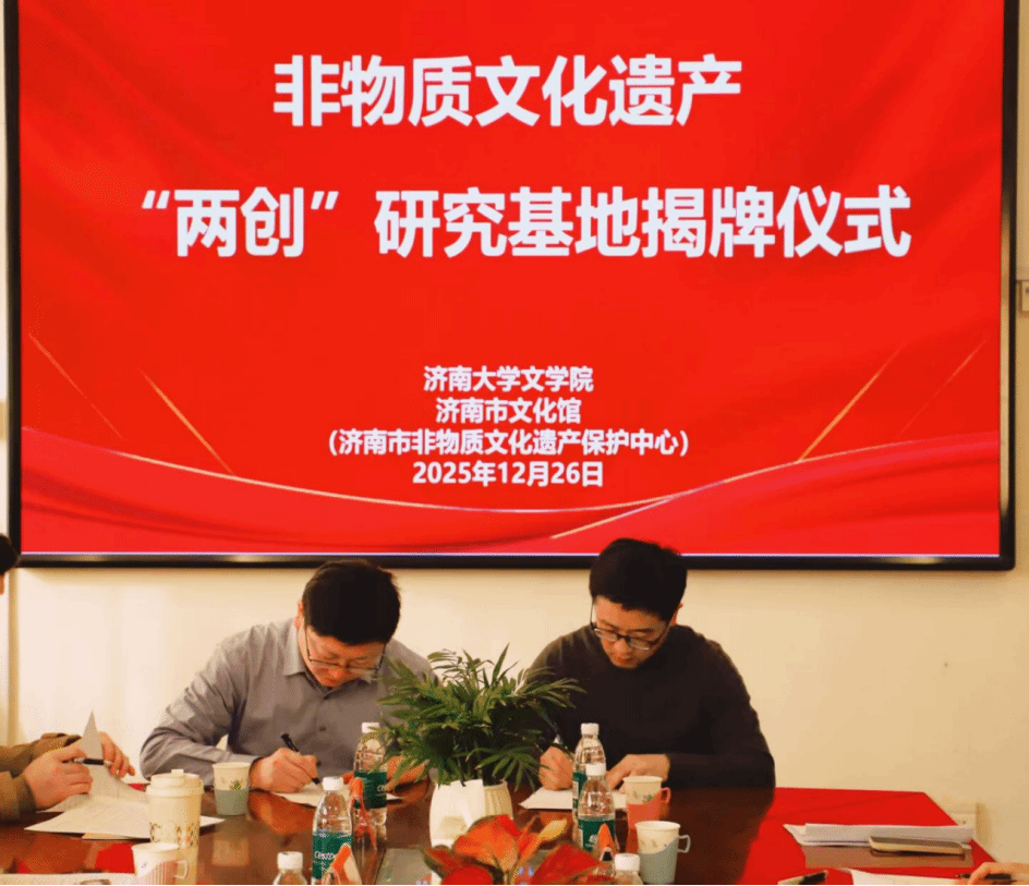 在与会嘉宾见证下,英国365集团院长助理王恩旭与济南市文化馆副馆长付伟安签署共建协议;范丽敏院长与张琳馆长共同为“济南市非遗‘两创’研究基地”揭牌,标志着该平台正式启动。